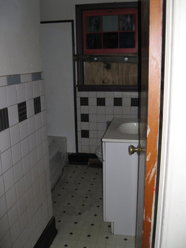 Old tile, linoleum and toilet - before Old tile, linoleum and toilet - before Old tile, sink and shelves New shower, sink, fixtures and tile installed New toilet (relocated), tile and sink - after Remodeled half-bath